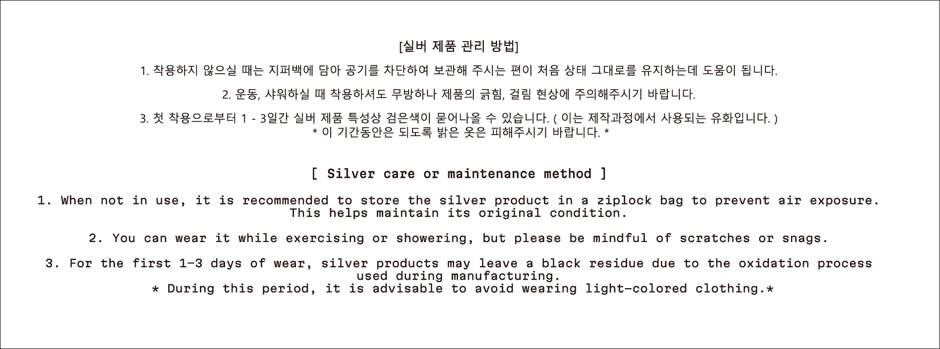 925 silver는 공기와 접촉 시 변색될 수 있으므로 착용 후 부드러운 천으로 닦아 보관해 주시기 바랍니다.