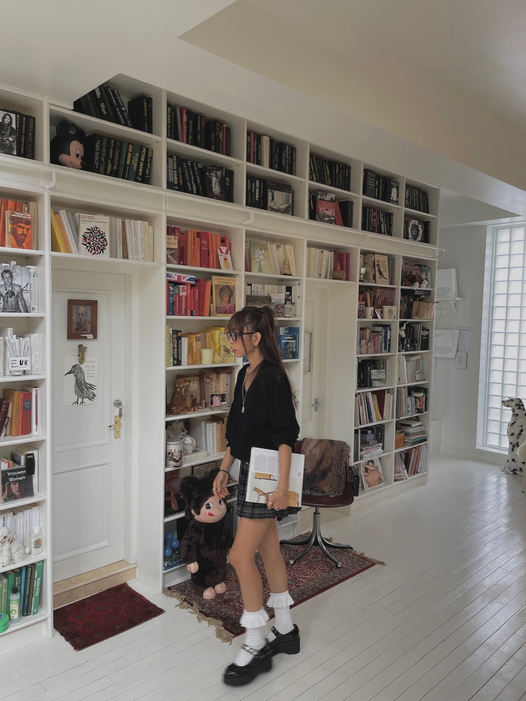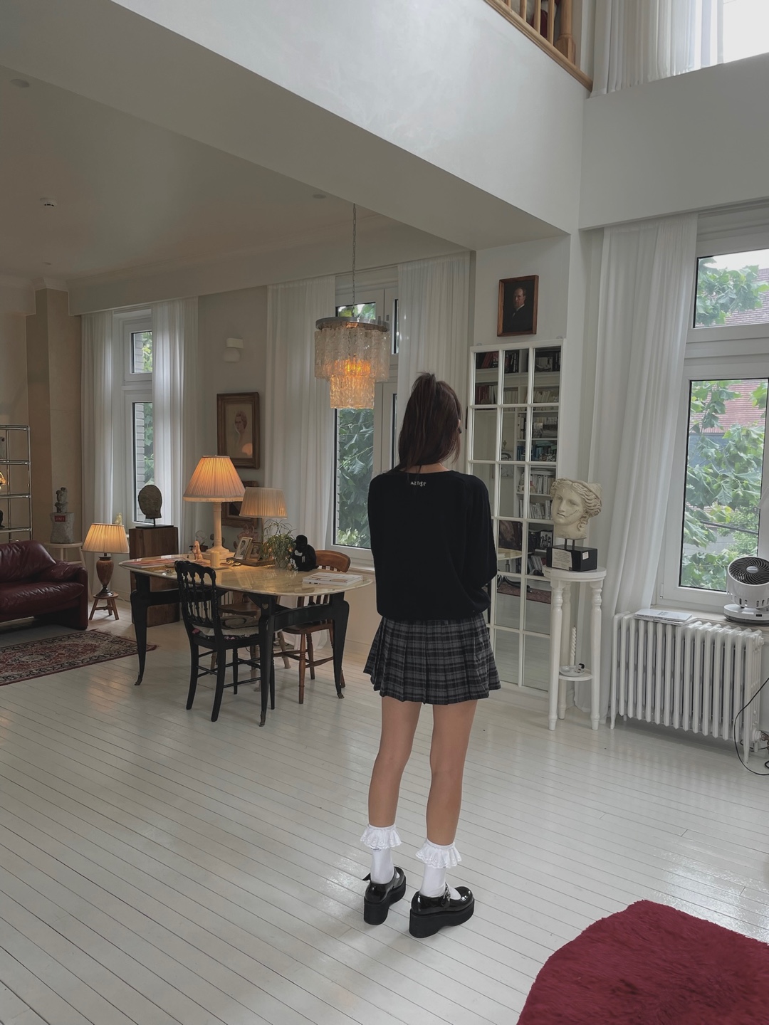 그레이 컬러 바탕에 차콜 컬러와 은은한 블루 컬러로 이루어진 체크가 가미된 하이 스쿨 체크 플리츠스커트는 미니 기장으로
