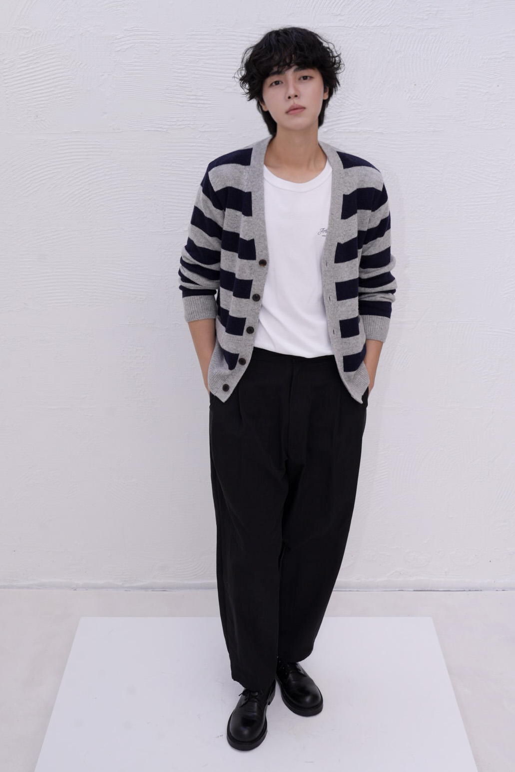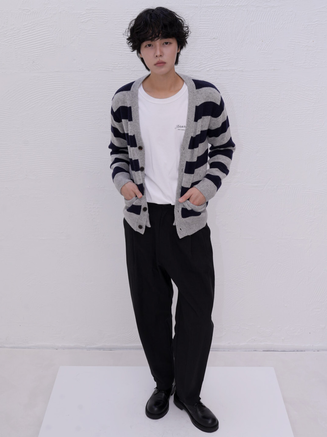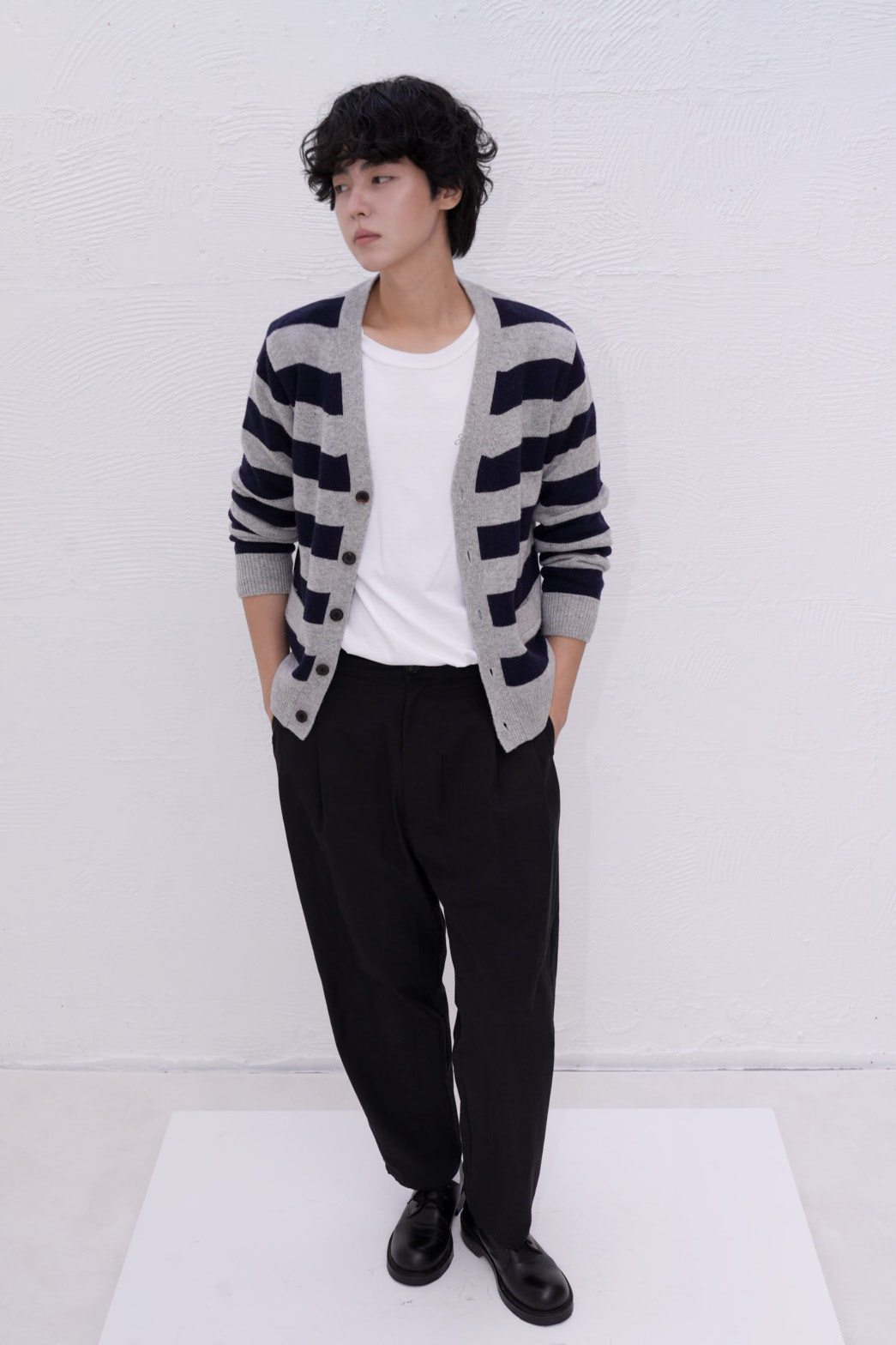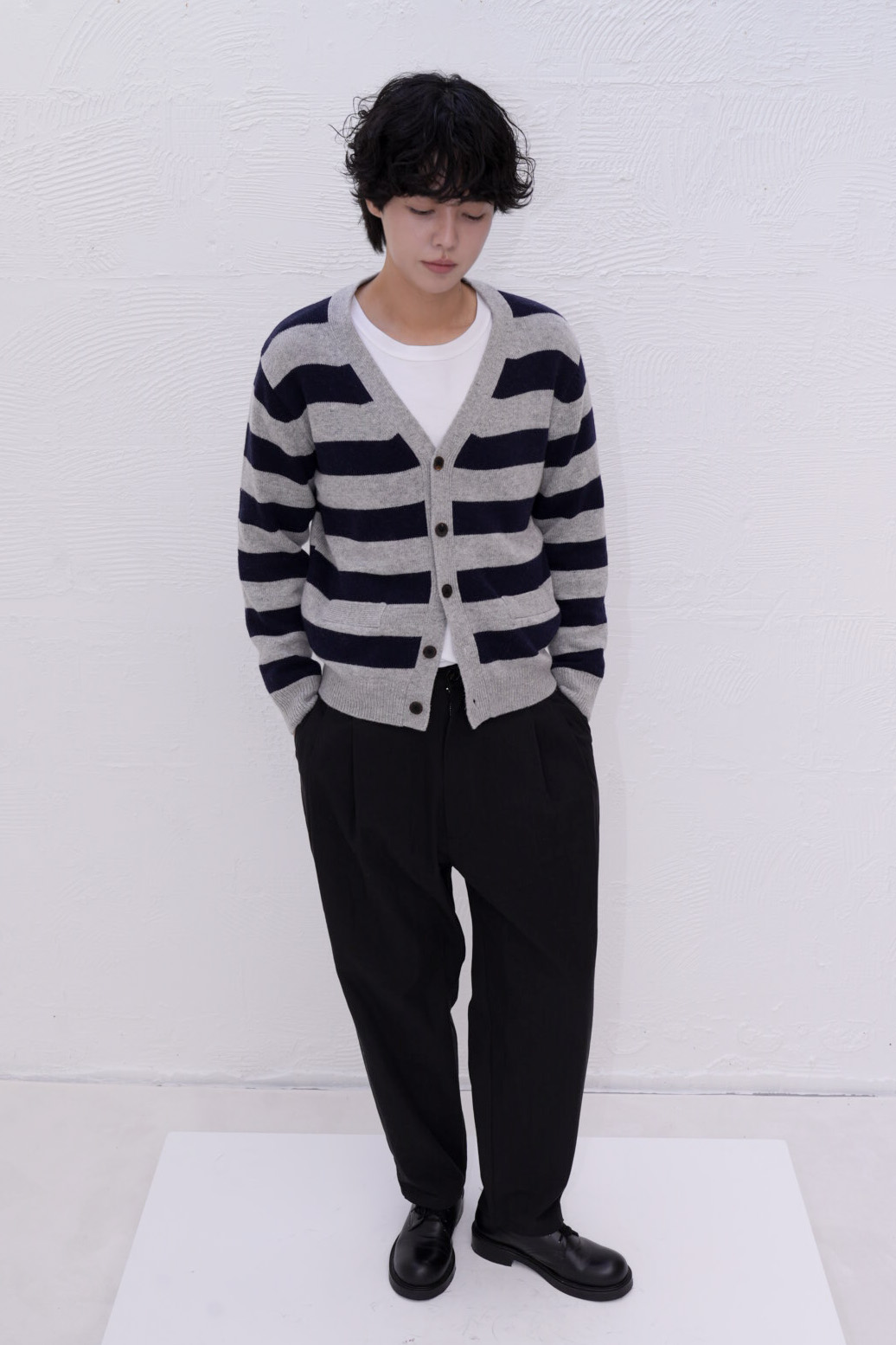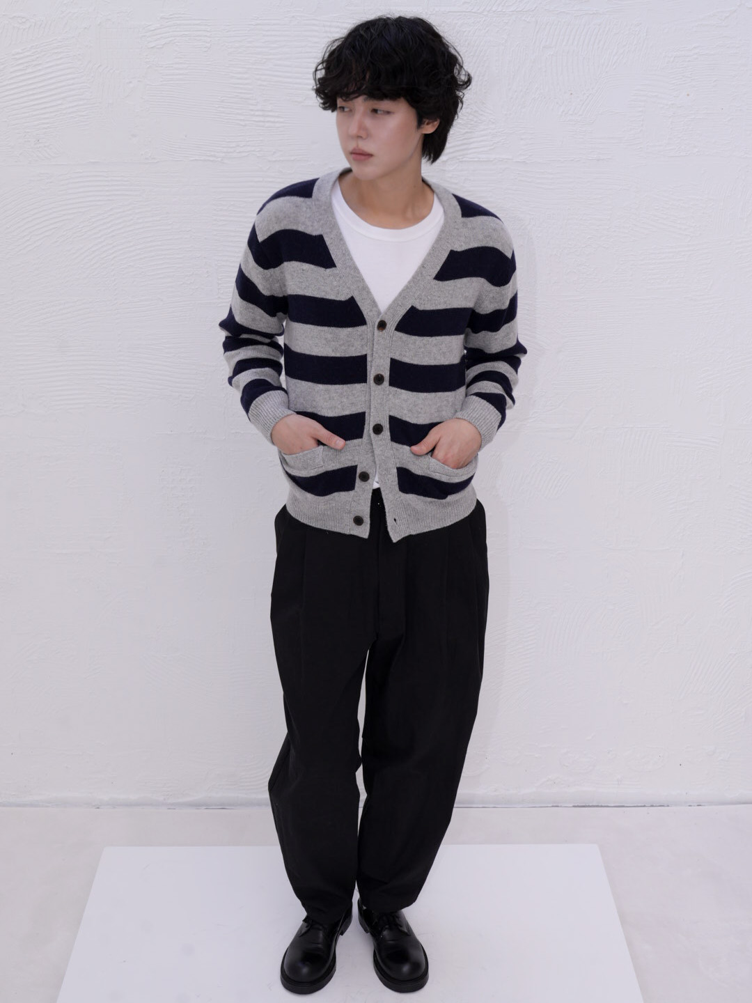 아티스트 스트라이프 브이넥 가디건은 램스울 혼방 소재로