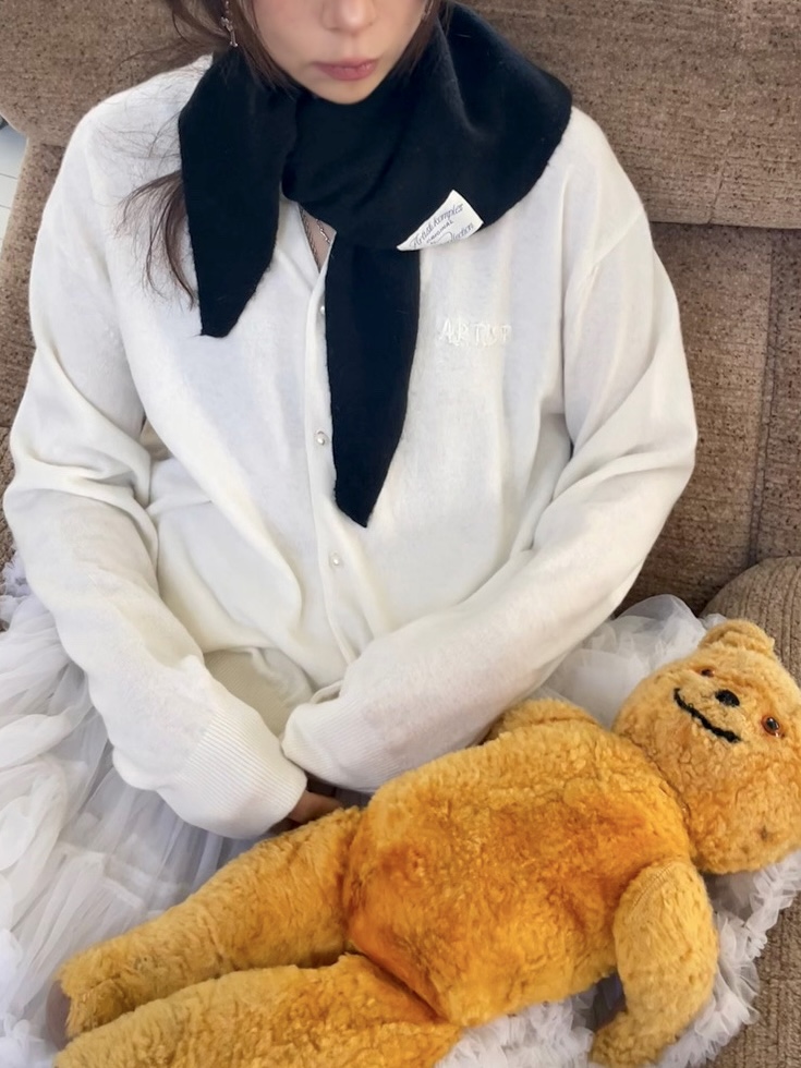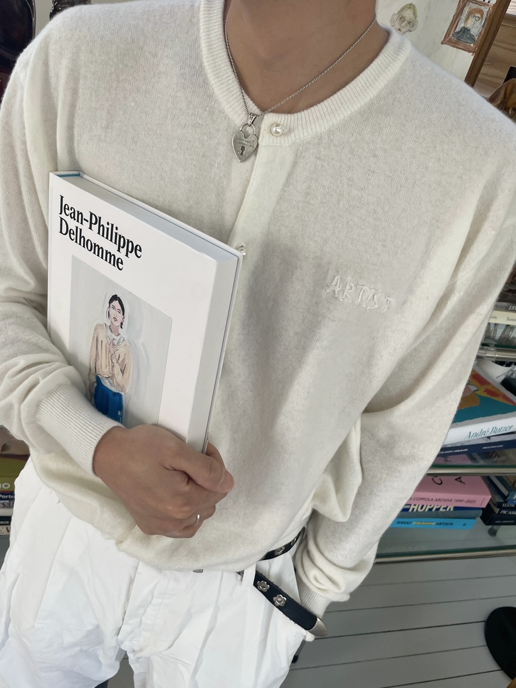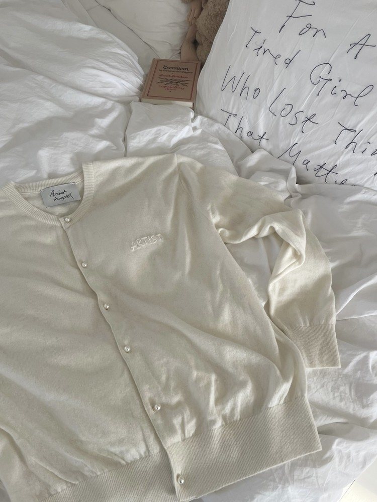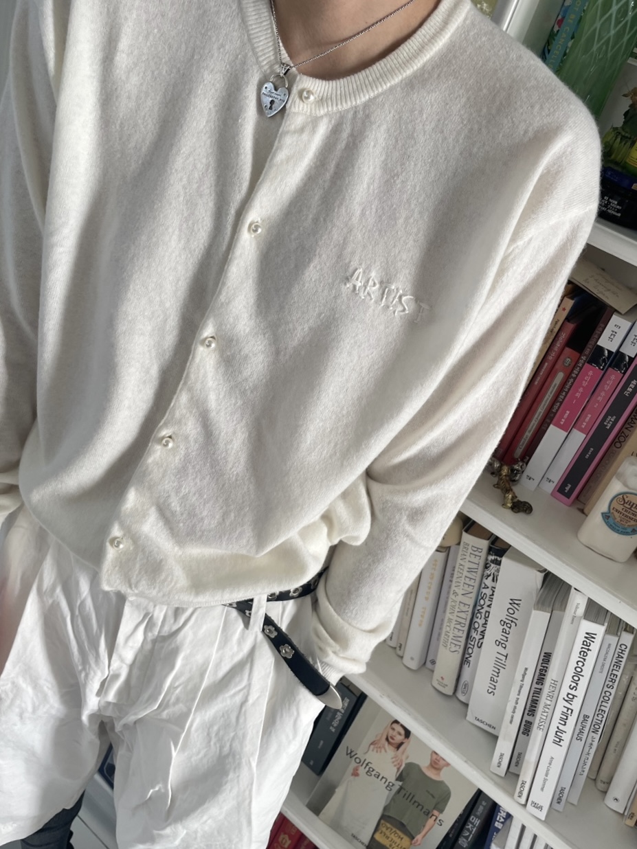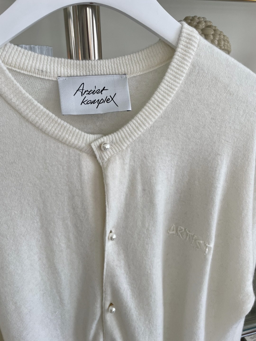 가슴 부분에는 아티스트 컴플렉스 디자이너의 손바느질로 디자인된 ARTIST 로고와 진주 단추가 포인트입니다.