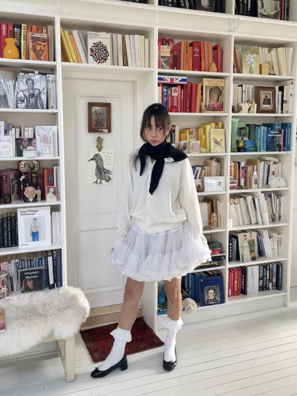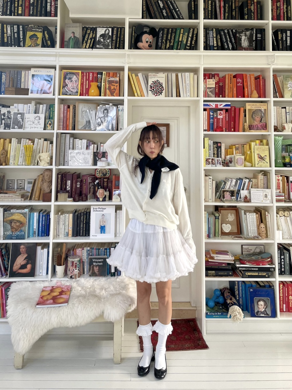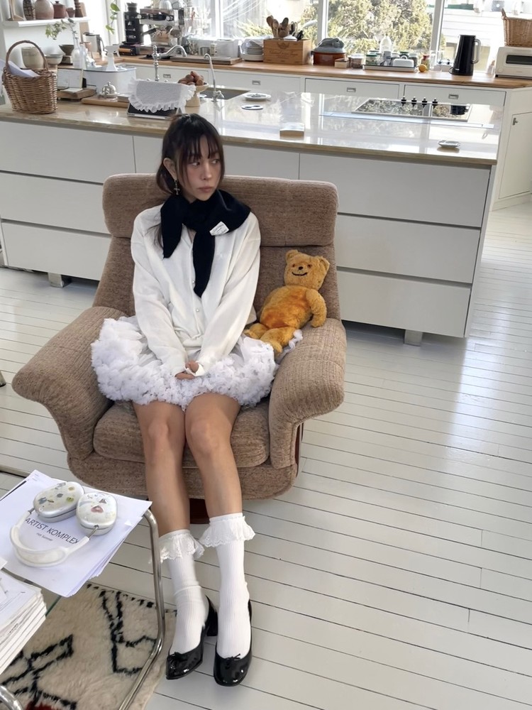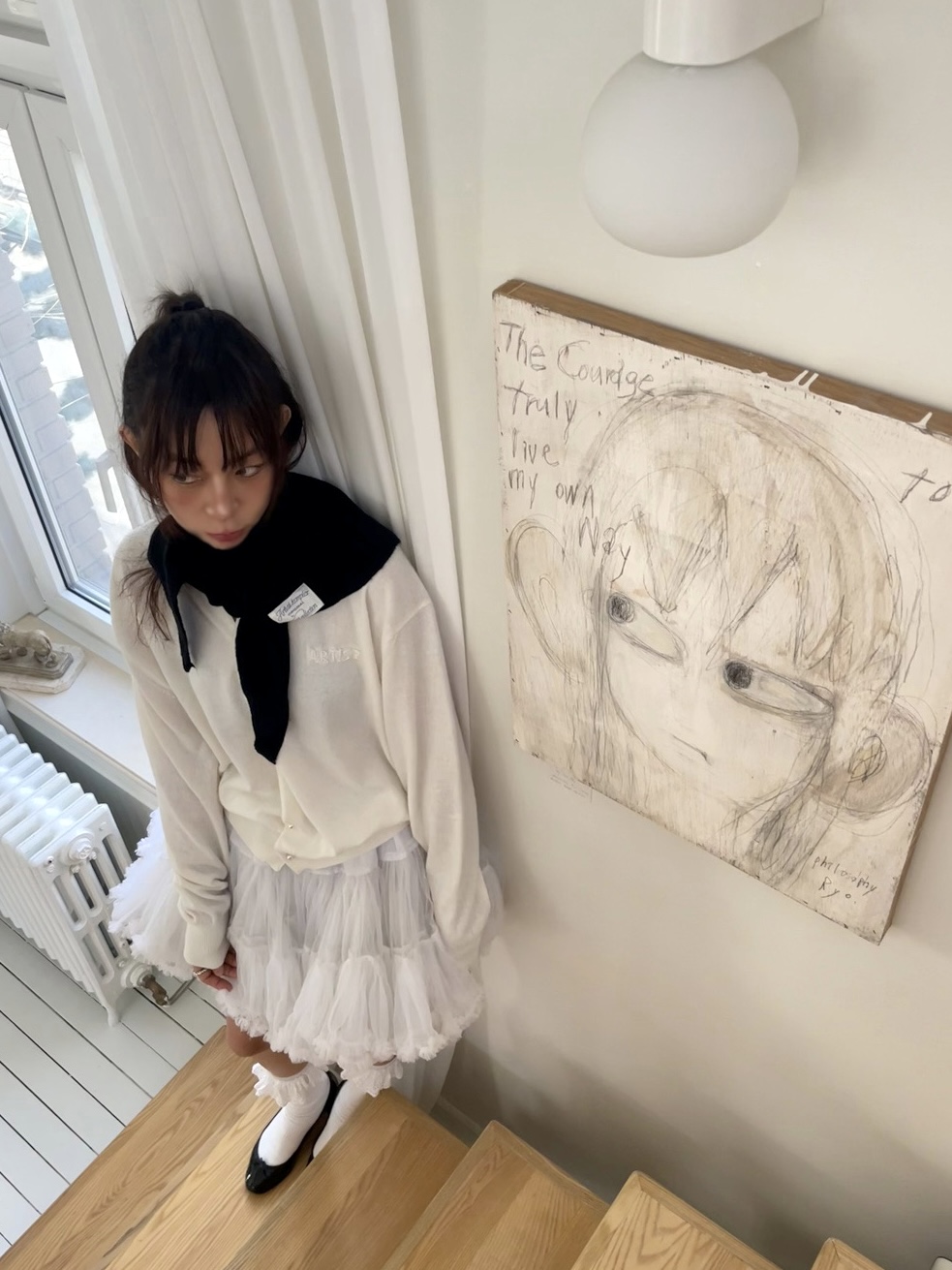 가슴 부분에는 아티스트 컴플렉스 디자이너의 손바느질로 디자인된 ARTIST 로고와 진주 단추가 포인트입니다.