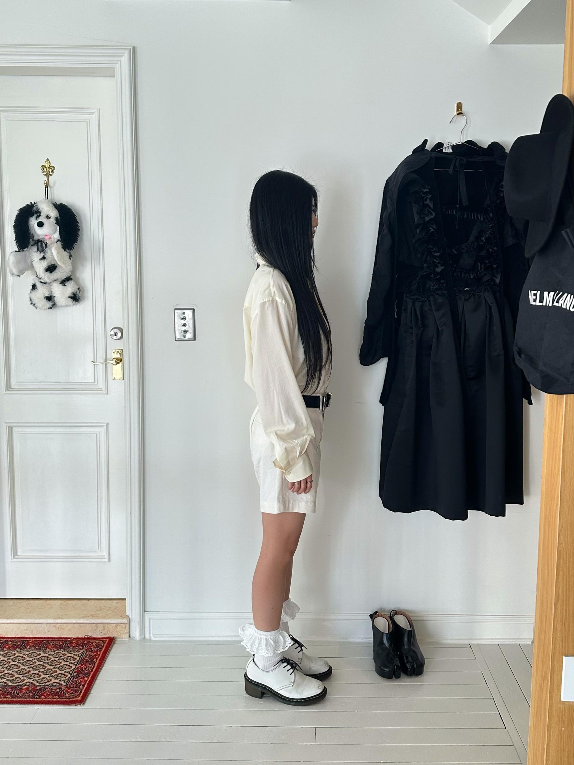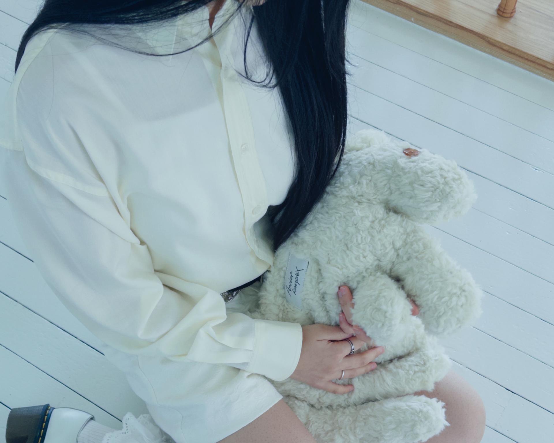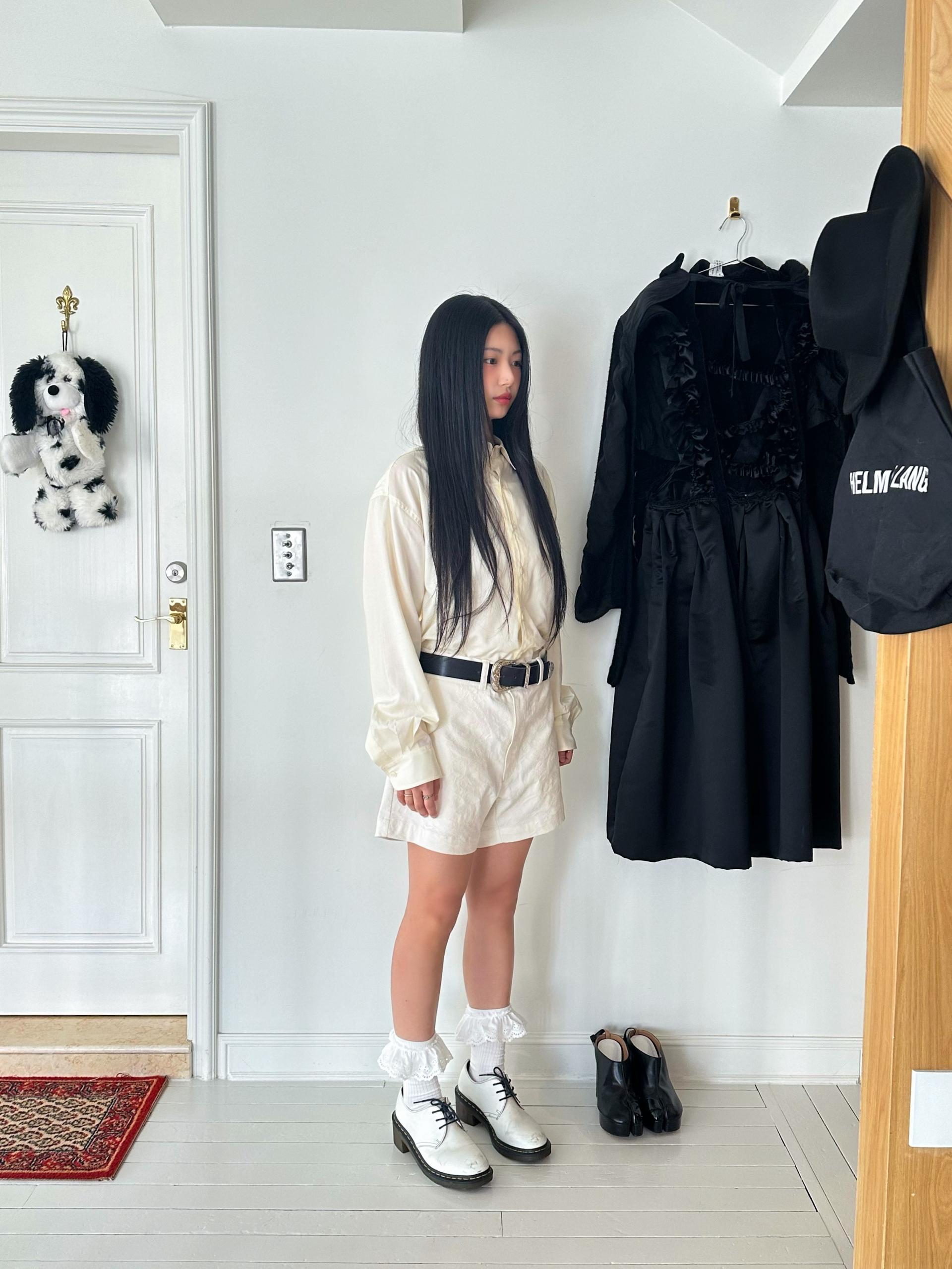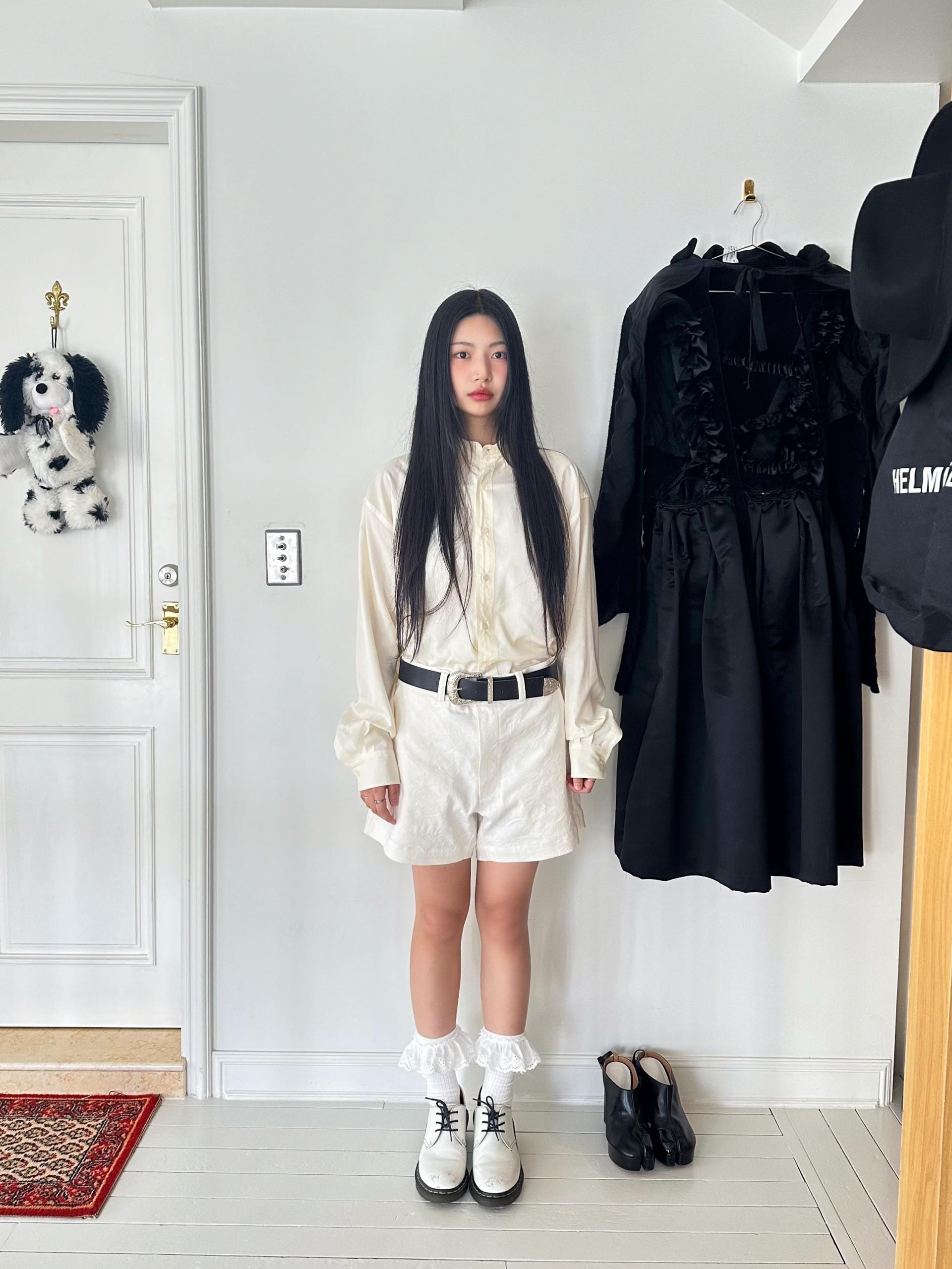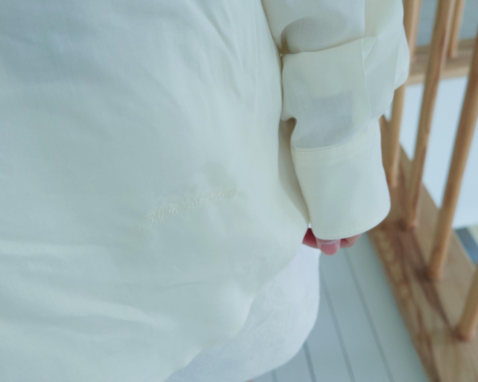 블라우스 밑단에 로고 자수를 더해 포인트를 주었으며,
