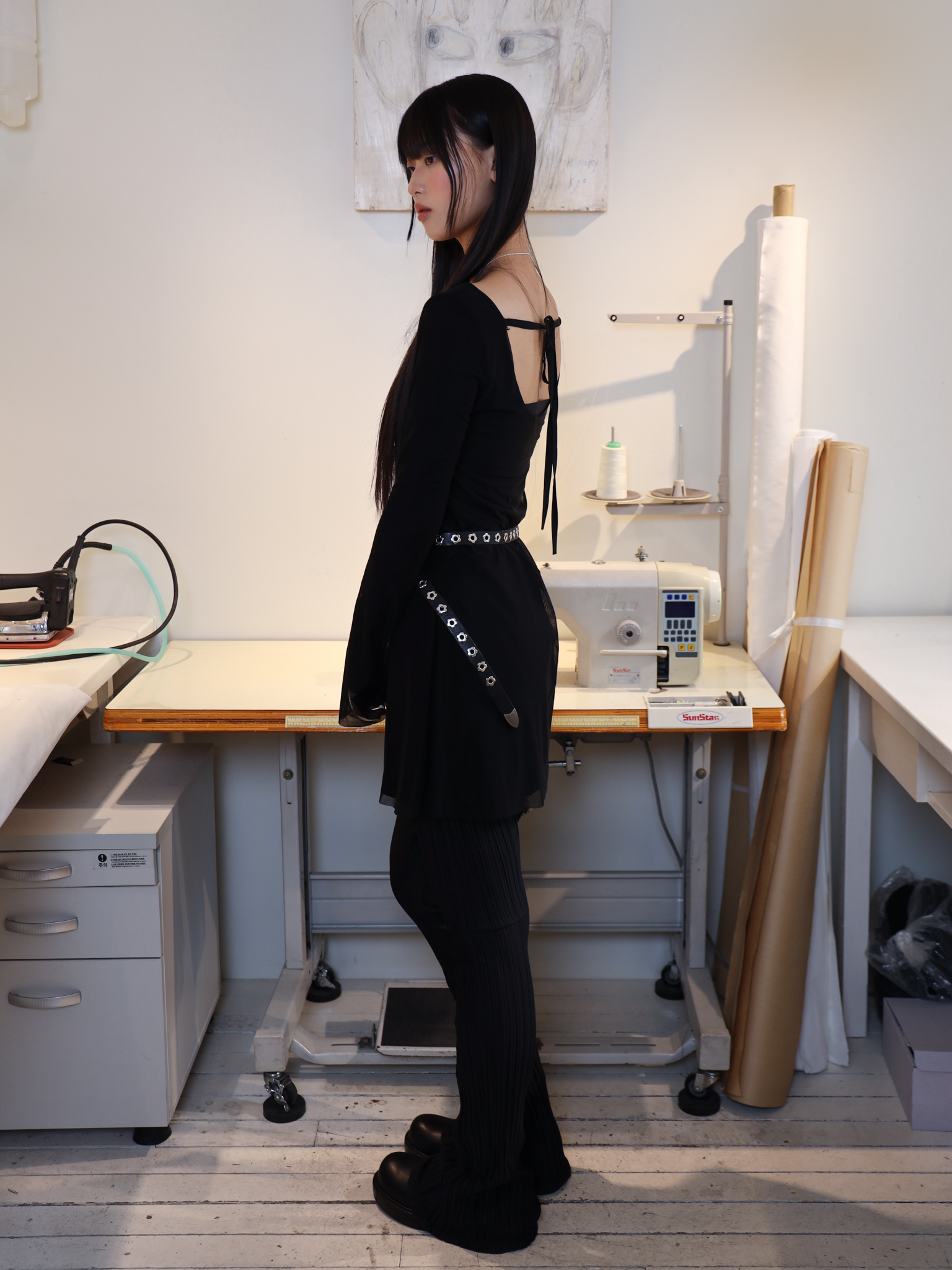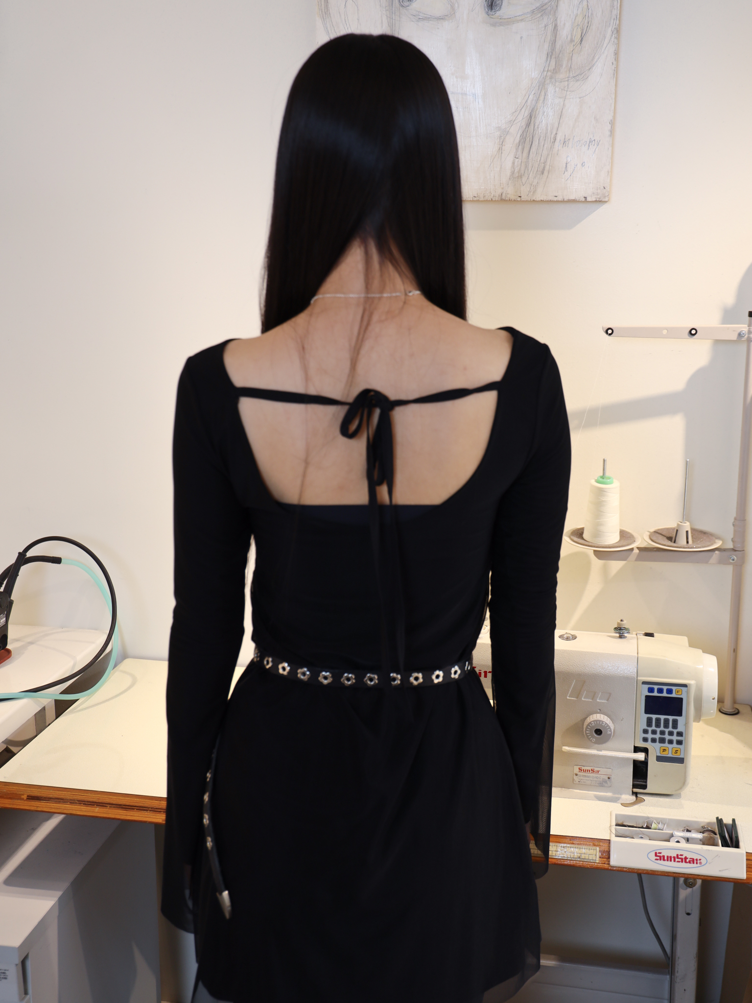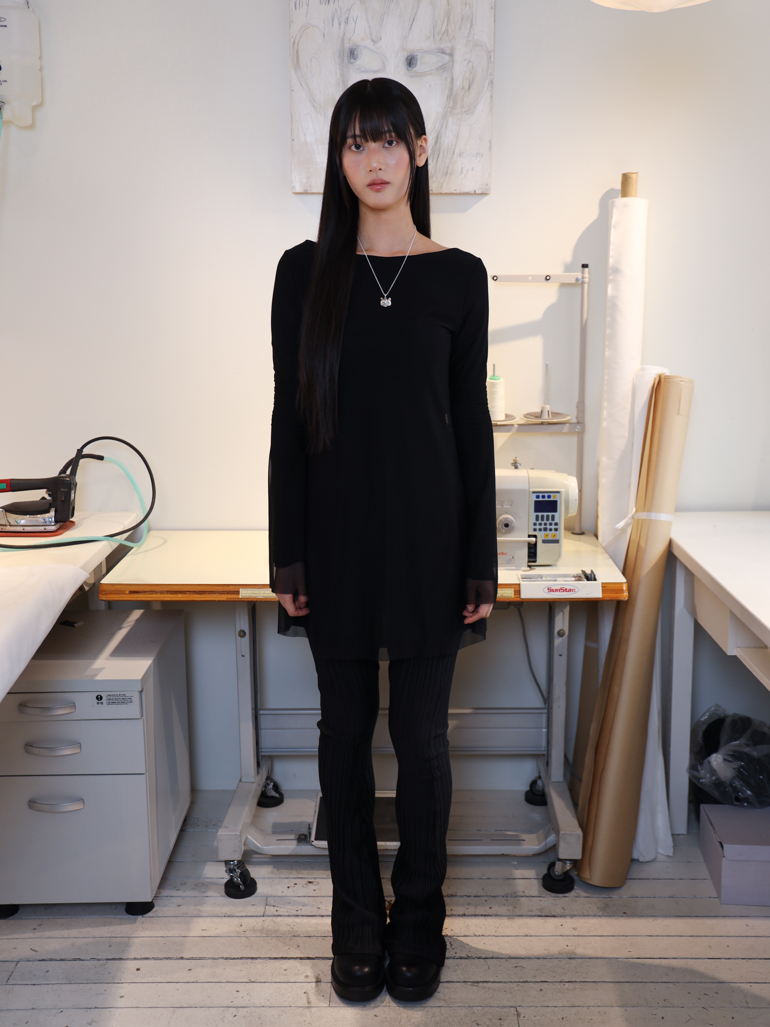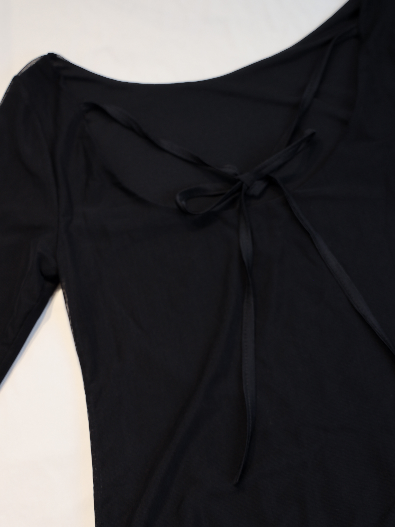 앞 넥라인은 보트넥으로, 등 라인은 적당한 깊이로 파여 있어