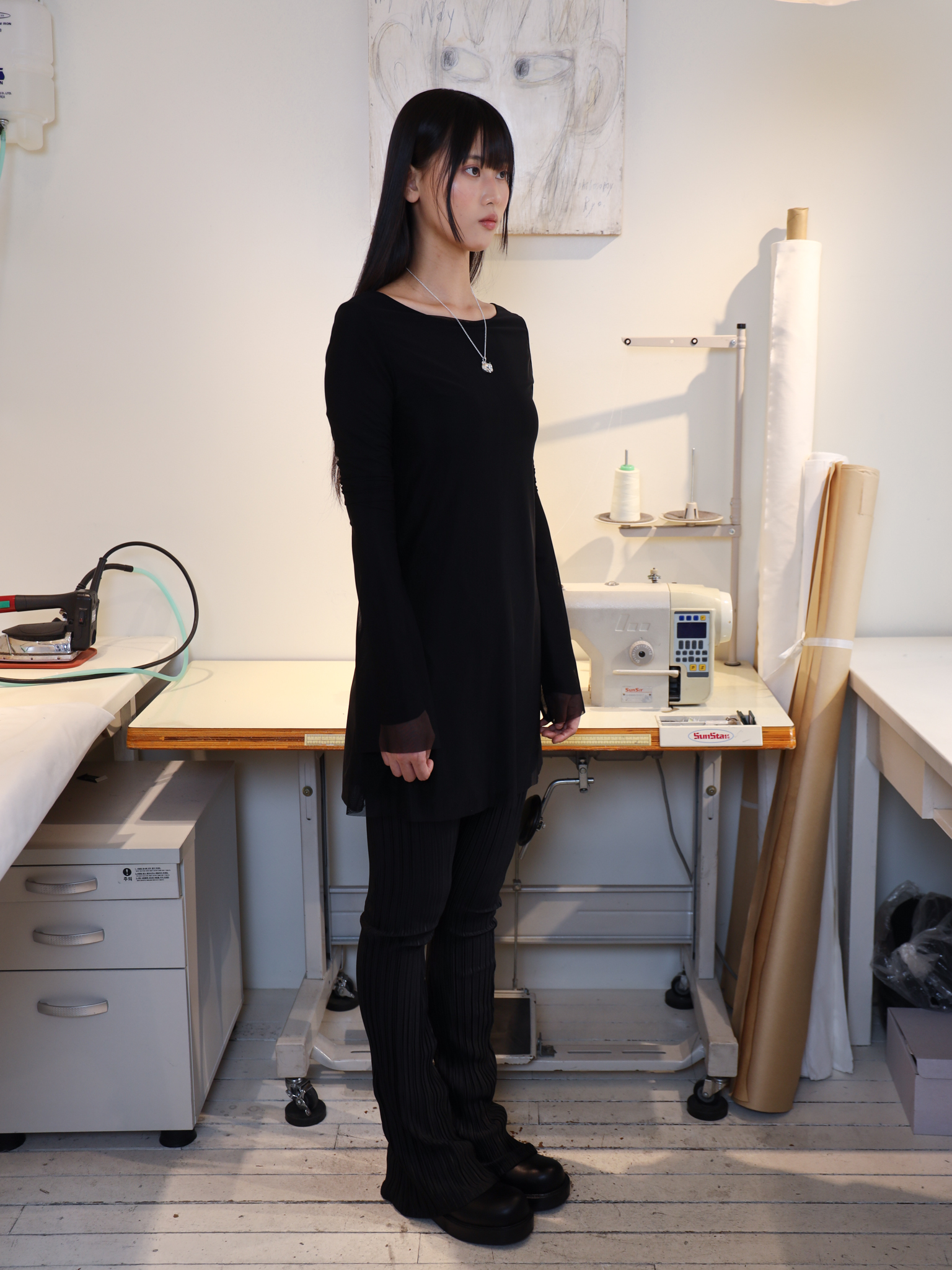 벨라인 소매와 자연스럽게 퍼지는 플레어 실루엣이 어우러져